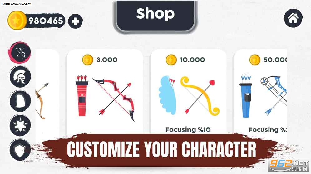 你可以在商店里找到一个棒棒手英雄需要的东西。 用各种头盔,盔甲,弓箭和特殊的力量定制你的弓箭手英雄。