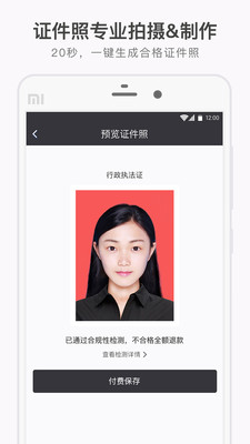 严格的拍摄环境检测,对人脸姿态、眼睛视线、双眼水平、服装突出、肩膀水平、光照充足、光线均匀进行检测,确保用户拍摄出合格的证件照。
