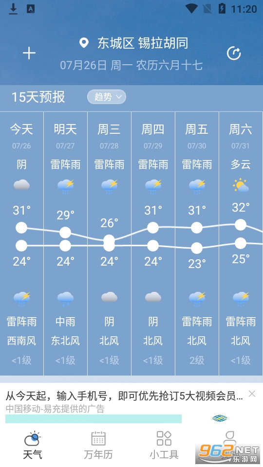 24小时天气预报:轻松查阅24小时内的天气变化,提早预防昼夜温差。