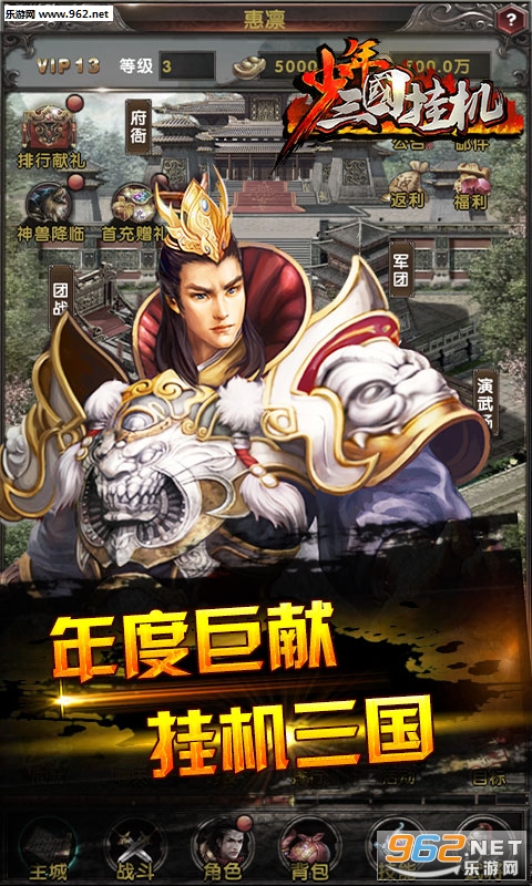 《少年三国挂机》上线送VIP13、500W金币、5000元宝、首冲礼包;