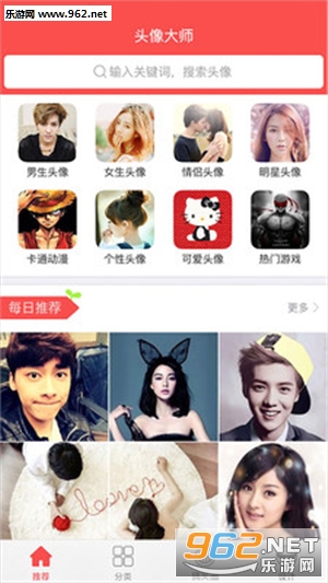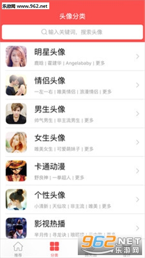 【个性】提供10大分类,200多个子类,分类清晰明确,快速定位自己的爱好。让你的头像与众不同,个性十足。
