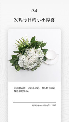 《花田小憩app》是一款充满着文艺小清新气息的以花卉为主的居家生活软件,软件每日都会为用户推送精彩的内容,其中包括园艺设计、家具搭配、花艺教学、婚嫁指南等各种涵盖生活领域的必备技能。用户不仅可以在软件中与和你一样爱花的人之间进行互动,还能让自己的生活变得更加有诗意!