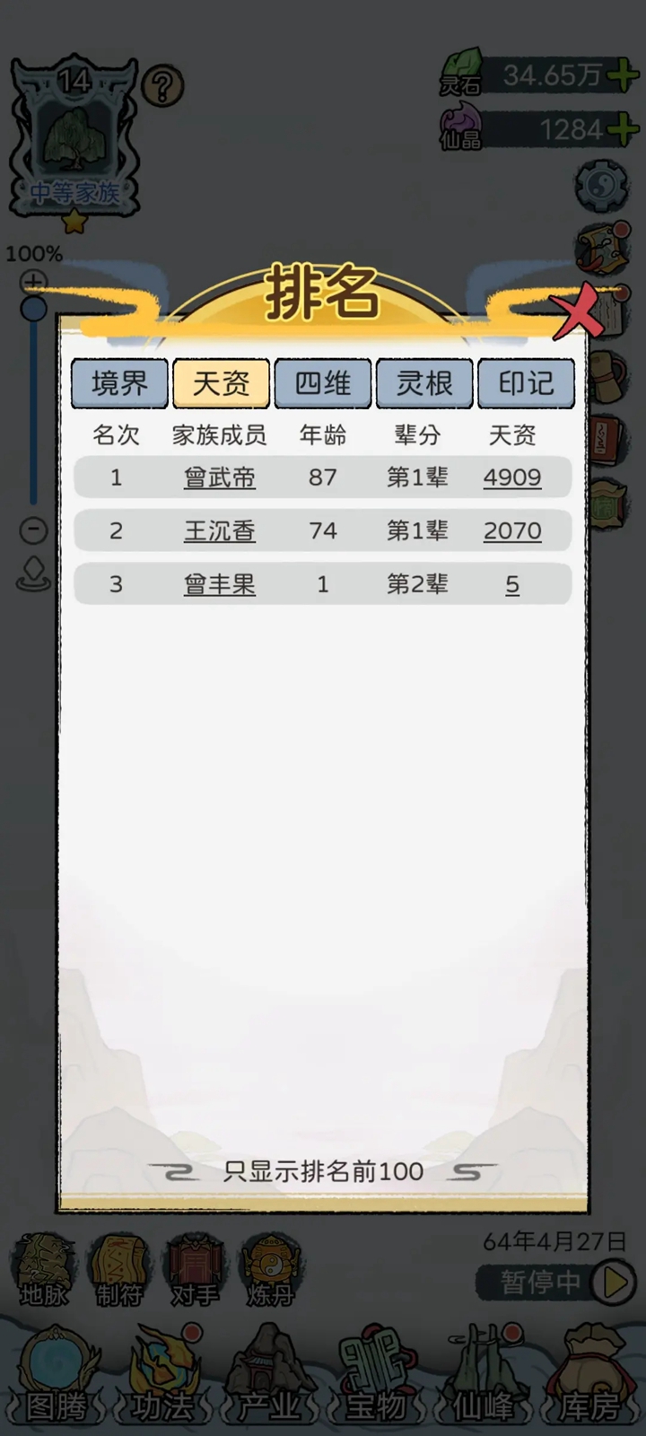3、重点:培养下一代只需要选择高的一脉给他培养天资,3岁6岁10岁都可以提升的事件(拉满选择最好的提升天资)还有其他提升天资的选项,族人不多就可以都选择,人多就培养天资一脉。留仙晶,事件60出头一次。
