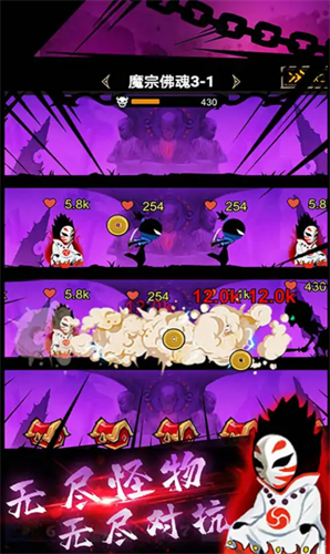3、游戏中打怪接近于无限刷怪,只要你有足够多的忍者,那么就可以体验超爽的闯关系统。