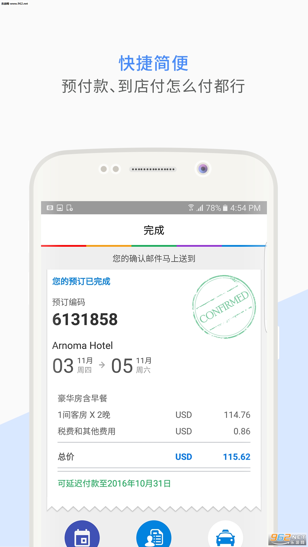 预订——使用已存的个人信息,预订只需点按几下,键盘都不需要了;一手掌握所有预订信息,无需打印,像回家一样无缝入住。