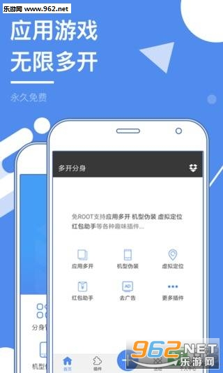 多开分身(应用多开、应用双开、应用分身)支持一部手机轻松实现本地软件和游戏的多开、双开,免ROOT支持虚拟定位、机型伪装、红包提醒等各种贴心功能。源自内核级技术、不占内存,快速稳定!商务、娱乐、游戏用户必备神器!