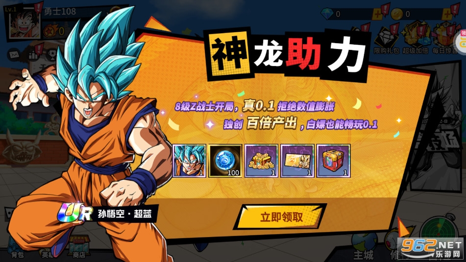 ★上线送8级Z战士,送10万充值、顶级UR孙悟空·超蓝、百连抽、超赛材料包