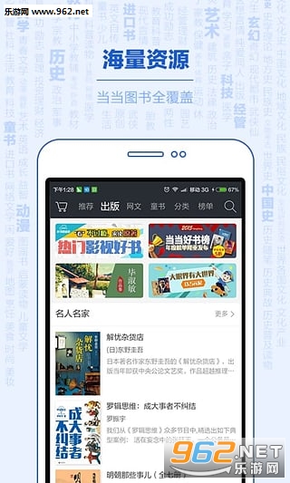 《当当读书客户端》是一款小说阅读与购买软件,如果你喜欢电子书,那么你就可以把它当做移动书架使用;如果你喜欢纸质书,那么就可以当它是网上书城。这里基本上有全网所有的小说与资源,还有许多作者入驻与读者分享书单。喜欢看书的小伙伴们就快来乐游网下载吧!