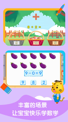 宝宝学数学加减法是一款针对3岁+宝宝设计的一款认识数字以及10以内的加减法的游戏。通过精心设计的卡通动画学习场景让宝宝认识数字0-9,场景有趣贴心宝宝一定会很爱上这些数字。并且通过四个有趣的场景游戏帮助宝宝更加巩固学习成功,并且引导宝宝学习简单的10以内的加减运算。通过精心的设计了各种场景包括超市,购物,果园等有趣的场景达到寓教于乐的效果。让宝宝在快乐学习的中健康成长。