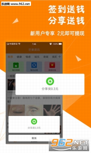 无论是社会时事、各类段子、福利美图、养生健康、运动技能……芒果资讯帮您一网打尽,让你成为朋友圈有趣有范儿的话题达人。同时分享可赚取零花钱哦!