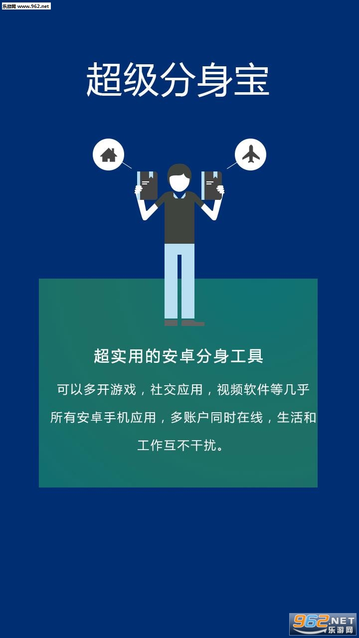 《超级分身宝app》是一款利用平行空间原理为用户提供两个或多个分身版或其他安卓手机应用的辅助工具。可以多开游戏,社交应用,视频软件等几乎所有安卓手机应用,多账户同时在线,生活和工作互不干扰,娱乐和游戏酣畅淋漓,让你的手机与众不同。超级分身宝安全,稳定,流畅,是一款极简,极速响应的黑科技多开应用。