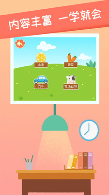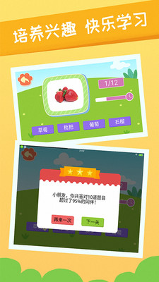 计时通关设计,准确错误提示,通过引入适度竞争,提升宝宝认知事物,学习汉字英文的主观能动性。