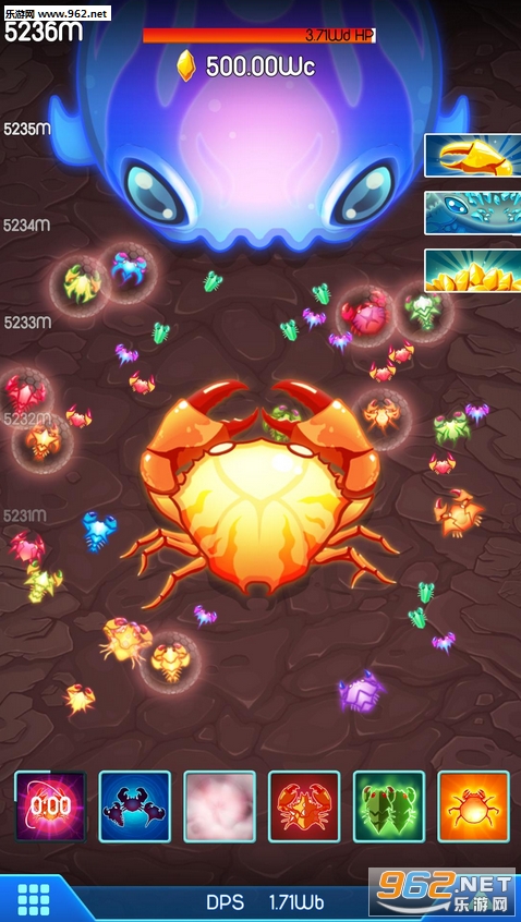 游戏的玩法简单而粗暴,就是点击屏幕释放大量的螃蟹来攻击屏幕上方的怪兽,你可以用一根手指,也可以选择用多根手指来攻击螃蟹,手指的速度越快就会释放出越多的螃蟹,就可以更快地将怪物击垮,界面上方会显示怪物的血量,当怪物的血条耗尽就会出现另外一个怪物,消灭一定数量的小怪之后会出现BOSS,BOSS的血厚比较难消灭。