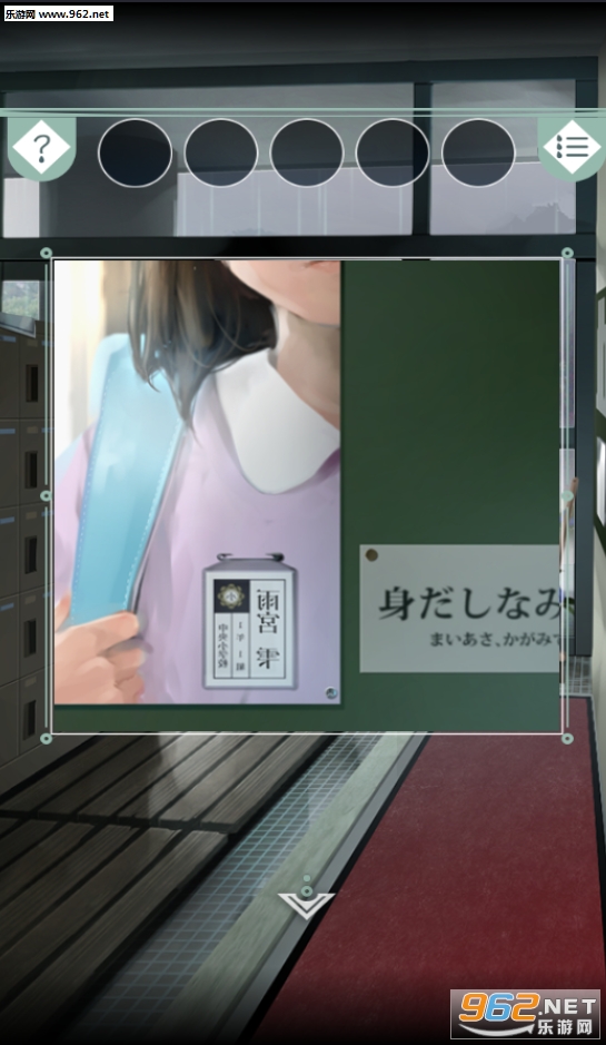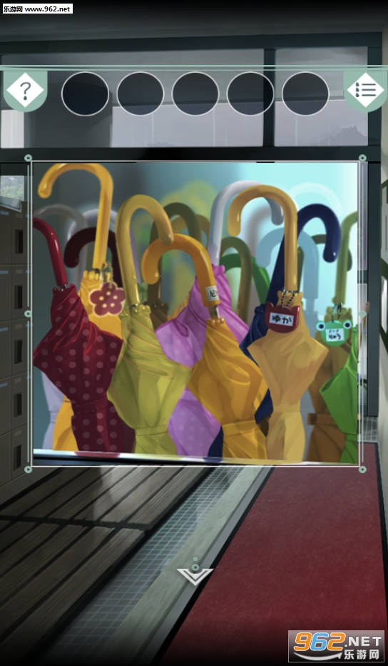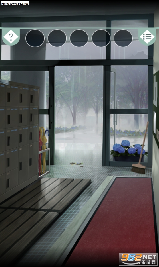 1.查看右边的玻璃得知自己的名字是雨宫雫(小学一年级妹子),查看左边下方扫除柜拿到毛巾,查看左边上方柜子得知找名字相同的柜子,打开(雨宫)的柜子获得雨靴,用毛巾擦干净污渍看到花纹,查看伞架处有花纹的那把伞,走入雨中,发现这把伞和自己的伞花纹不一样,过关。