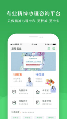 “恩恩医生”是专业精神心理健康服务平台,汇聚全国知名精神心理科专家,充分利用移动互联网,整合优质医疗资源,为用户提供免费咨询、在线预约医生、免费自我测评、健康资讯等精神心理健康服务。用户可以通过图文、电话、视频等方式,与精神心理科专家进行一对一私密交流,真正实现了不出家门就能问诊专家!