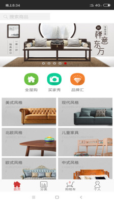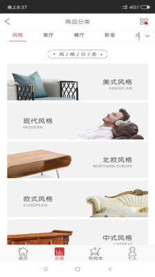 以风格来区分共有北欧风格、欧式风格、中式风格等8大版块,更有全屋购、买家秀、品牌汇等实用版块。多维度体验优质家居选购。