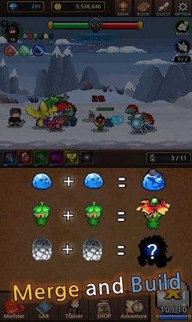 3、像素风格冒险,可以使用不同的怪物合成进化出新的怪物,自由搭配你的团队,在这个世界上战斗和收集更强大的怪物。