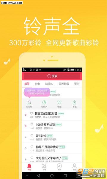 《彩铃大全app》是一款好用的彩铃软件,独家支持三网彩铃,更新速度快分类多。还有铃声剪辑功能,让你的来电更有个性,是一款比较好用的铃声软件!感兴趣的朋友们快来乐游网下载吧!
