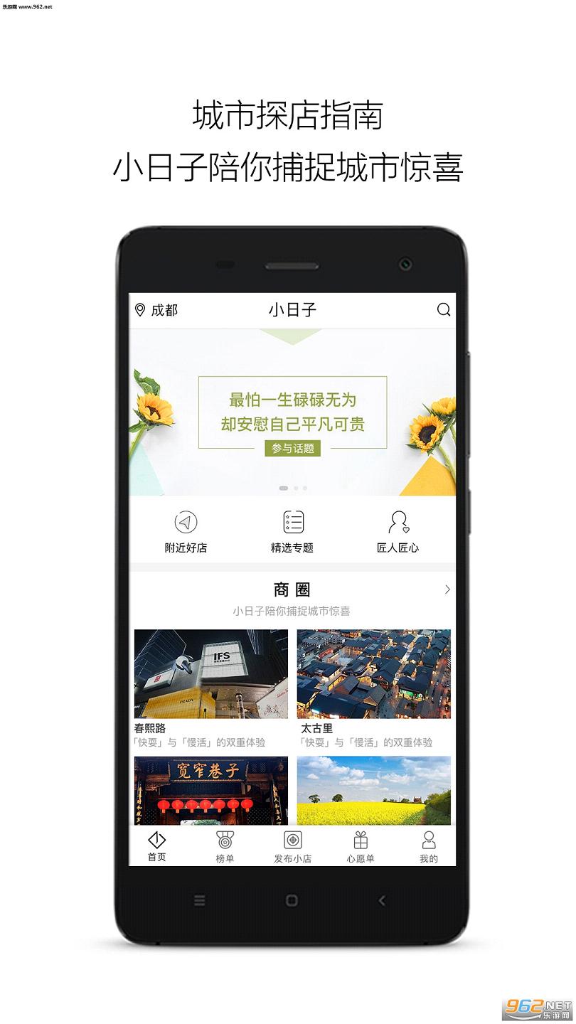 小日子是一款推荐城市美好生活的APP,内容包括优质小店推荐,每日话题讨论,匠人故事分享,周末优质活 动体验,用不同的视角带你了解你身处的城市,是乐活er的城市生活和独特的生活方式指南。