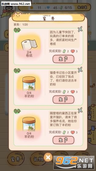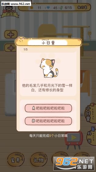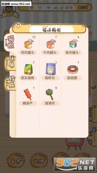 游戏性还不错,系统功能比较完善,金币获取渠道有:1、猫猫遛弯概率得2、突发事件送3、奖券开礼物,奖券做家务和遛弯得,攒到15个有一个小礼物,4、小电视看广告,可能钻石可能金币。
