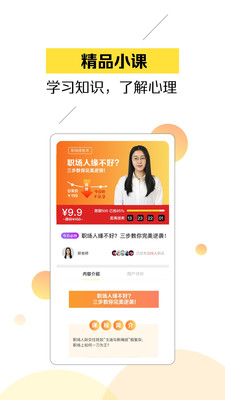 芒果心理app是一款关于心理课程以及咨询问答的心理服务软件。芒果心理app不仅汇聚了知名心理教授及教师,提供婚恋情感,情绪压力,亲子关系,职场发展,人际交往,个人成长六大品类的心理课程以及心理问答,更涵盖了与美国加州大学河滨分校联手推出的国际证书学习课程,即美国加州大学心理咨询师认证证书,又称“ucR心理咨询师认证证书”。让心理知识学习及心理服务触手可及,致力于提升全民心理健康水平。