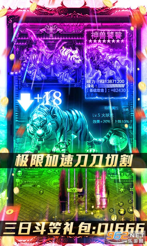 《烈焰皇朝-极速切割版》是一款全新传奇热血单职业手游,它秉承并丰富了传奇的复古玩法,一人是战亦是法道,开局带一只白虎,战士刺杀,法师火墙,道士招狗一人全可拥有,刀刀切割,刀刀光柱,刀刀麻痹,上线输入礼包码YB666即刻领取千万元宝,丰富热血的攻沙玩法,让你进入当年传奇攻沙场景,带你重温沙城经典!