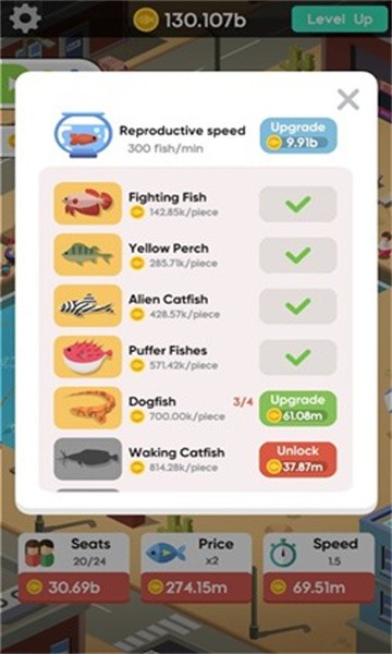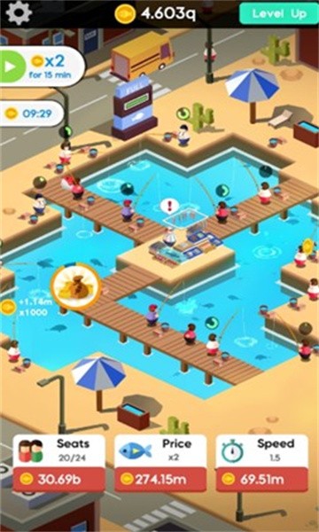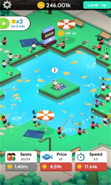 2、通过升级的方式获得更多设施,你还能不断的发展,开设多个鱼塘,容纳更多的人;