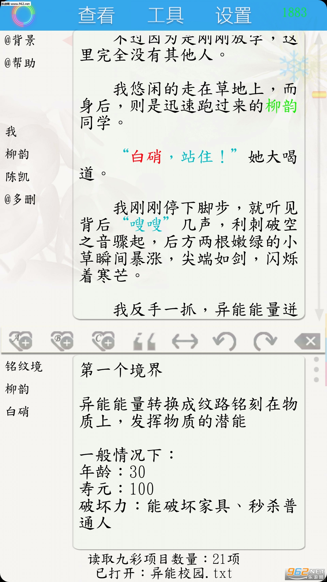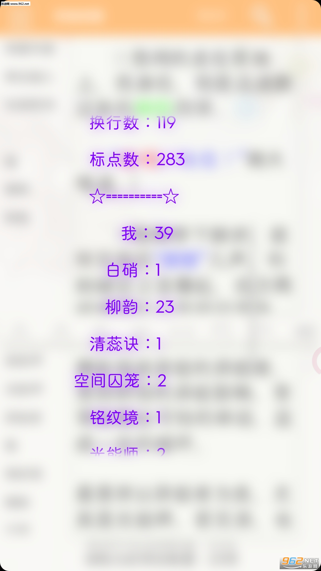 20、字数统计:不仅有超详细统计(汉字/数字/字母/空格等),而且能统计人物/地点/技能等出现的次数;整部书籍字数统计。