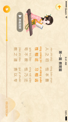 让孩子直接就能跟着软件学习三字经,接受国学启蒙。软件内的资源非常丰富,文字语音视频等多种内容应有尽有,非常实用。