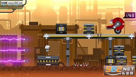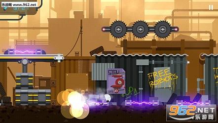 游戏在画风上营造了一种浓浓的科技感,由于游戏的设定要求必须将场景设置在拥有流水线的工厂之中,因此当我们第一次接触到这款游戏时,会发现场景中有大量的机器人残骸以及加工设备等道具。当然,在画面的塑造方面,游戏也有着自身的优点与不足,首先在优点方面,场景中敌人攻击、障碍陷阱等效果的展示表现不错,光影结合的也很好;但总的来看,场景的变化较少,不同章节之间也仅仅是背景颜色的改变,长久游玩会有一定的腻烦感。