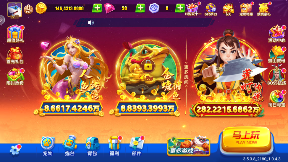 刺激:除了普通的捕鱼玩法,更有高倍率捕鱼房间,更高的回报,更刺激的玩法。