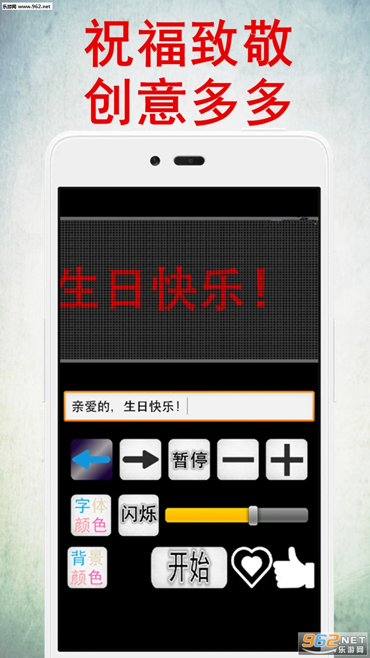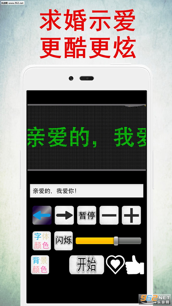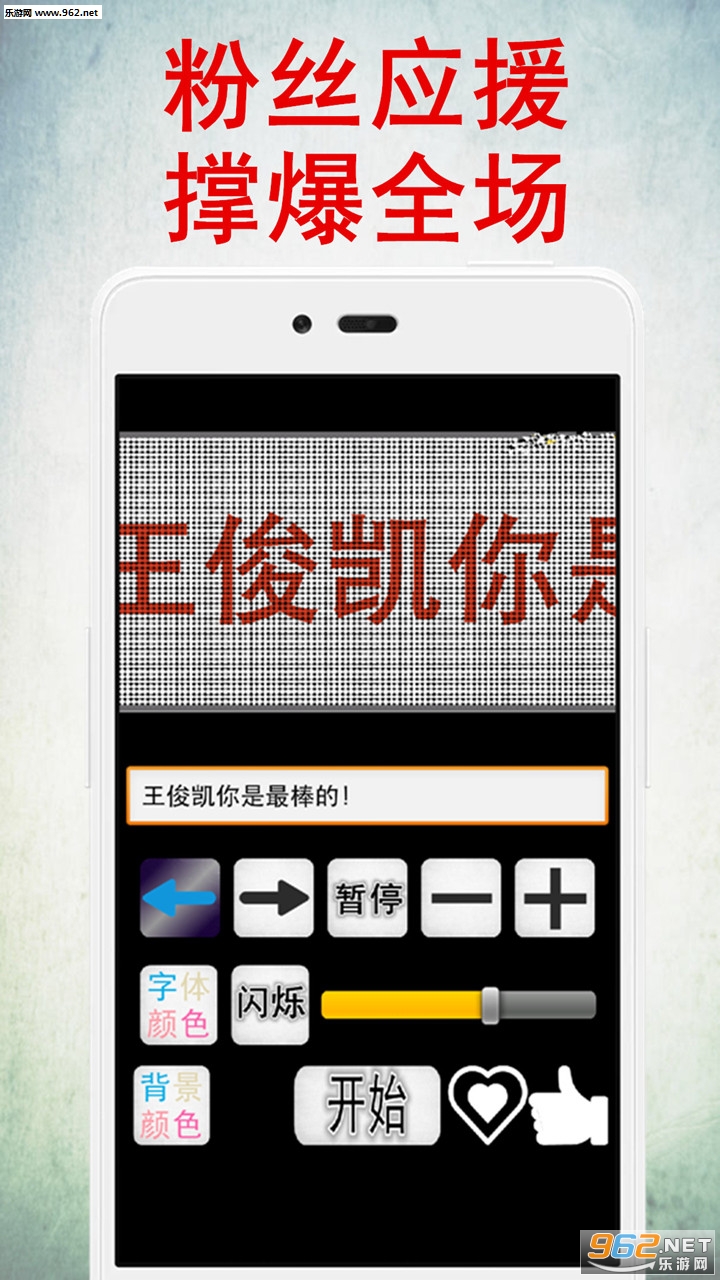 《LED灯牌显示屏app》由长沙树懒信息科技有限公司研发,是一款提供LED灯牌制作的软件;不管你是去演唱会为喜欢的歌手加油,还是去机场车站接人,还是向喜欢的人表白求婚,有充足的时间可以慢慢地准备,如果时间不足就可以使用软件来完成你的目的;演唱会要开始了,没有时间去购买应援牌和荧光灯,直接进入会场,打开软件输入文字,调整字体大小、滚动速度等,举起手机一样能为爱豆加油助威;喜欢的人提前回来,表白横幅还没有挂好,直接使用软件制作滚动字幕,用别具一格的方式向对方表白。