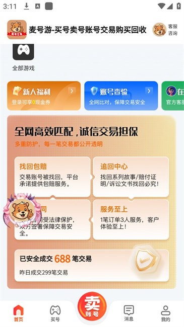麦号游最新版平台所提供的交易类型包含了时下热门的多款游戏,不管是你是买号还是买号该软件都提供了对应的交易板块,通过便捷的线上交易让游戏账号买卖变得更加高效,减少四处发布交易信息的麻烦。