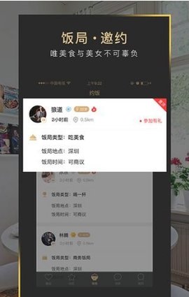 【饭局邀约】可以发布饭局邀约,也可以参加别的饭局。