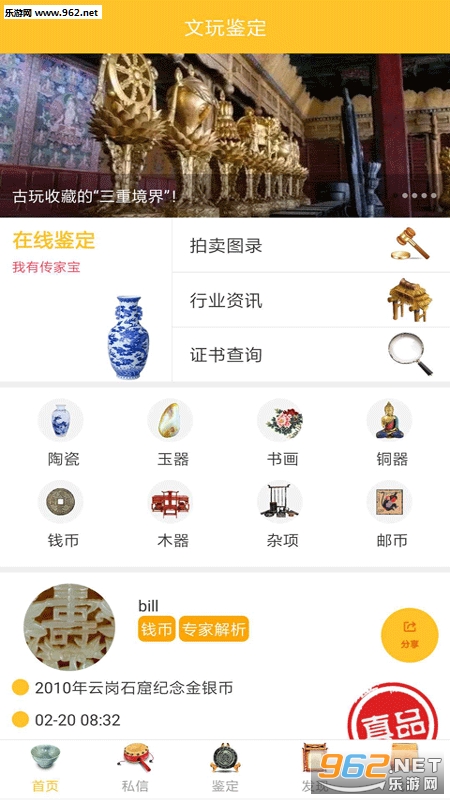 《文玩鉴定app》是一款文玩鉴定软件,上传你的宝物图片,会有专家在线帮助你鉴定,还可以在线与其他人交流。