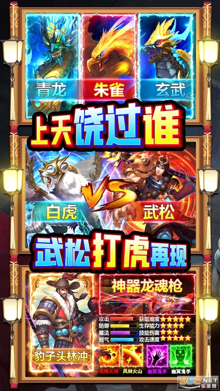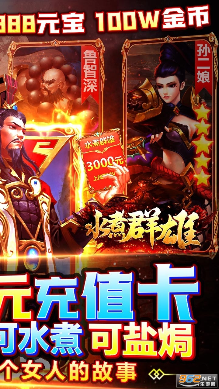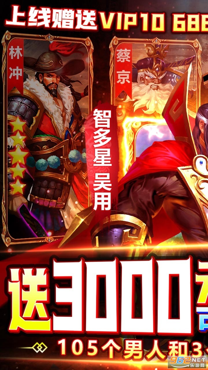 是一个105个男人和3个女人的故事!送3000元充值卡,上线赠送VIP10,68888元宝,100W金币,你的酒馆对你打了烊,每天赠送10连抽,月卡购买直接赠送超级武将鲁智深和徐宁,老虎一打一个准!