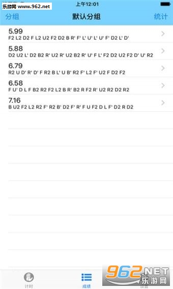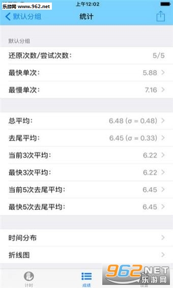 统计:可显示3次、5次、12次、50次、 100次平均以及分组平均、去尾平均,成绩详情可复制到剪贴板;可显示时间分布直方图和折线图。