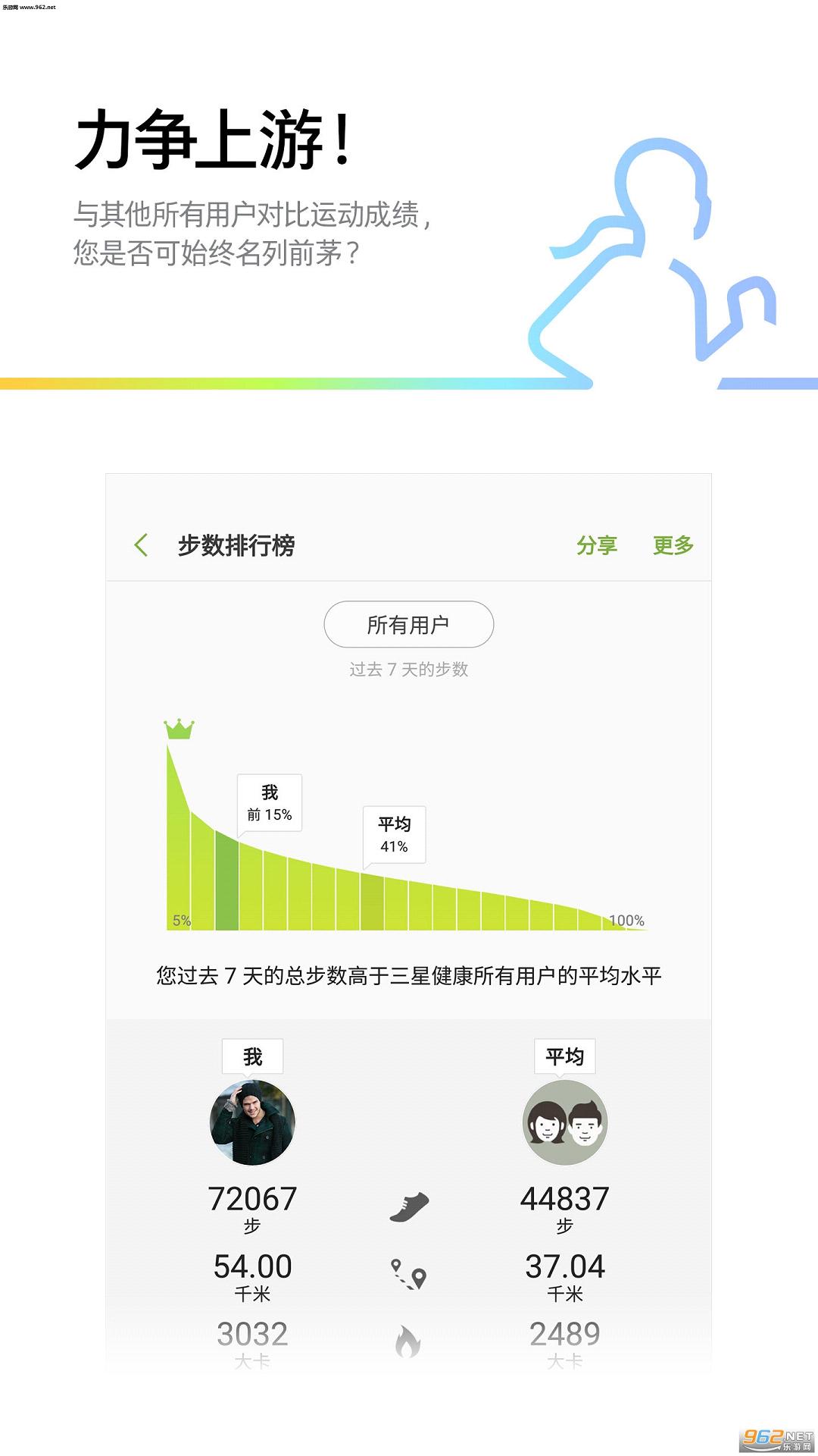 与好友比赛并查看您的排名。当您注册三星账户之后,就可与地址框中的好友进行比赛。在“一起运动”环节中,您可以选择自己的对手,并可将您的步数与全世界不同年龄段的人的步数进行比较。