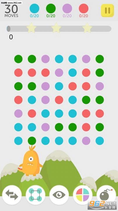 在奇妙星球的不同地域棋盘上,你只需要轻轻一点,在同一行列上相同颜色的小点(至少两个)就会自动消除。