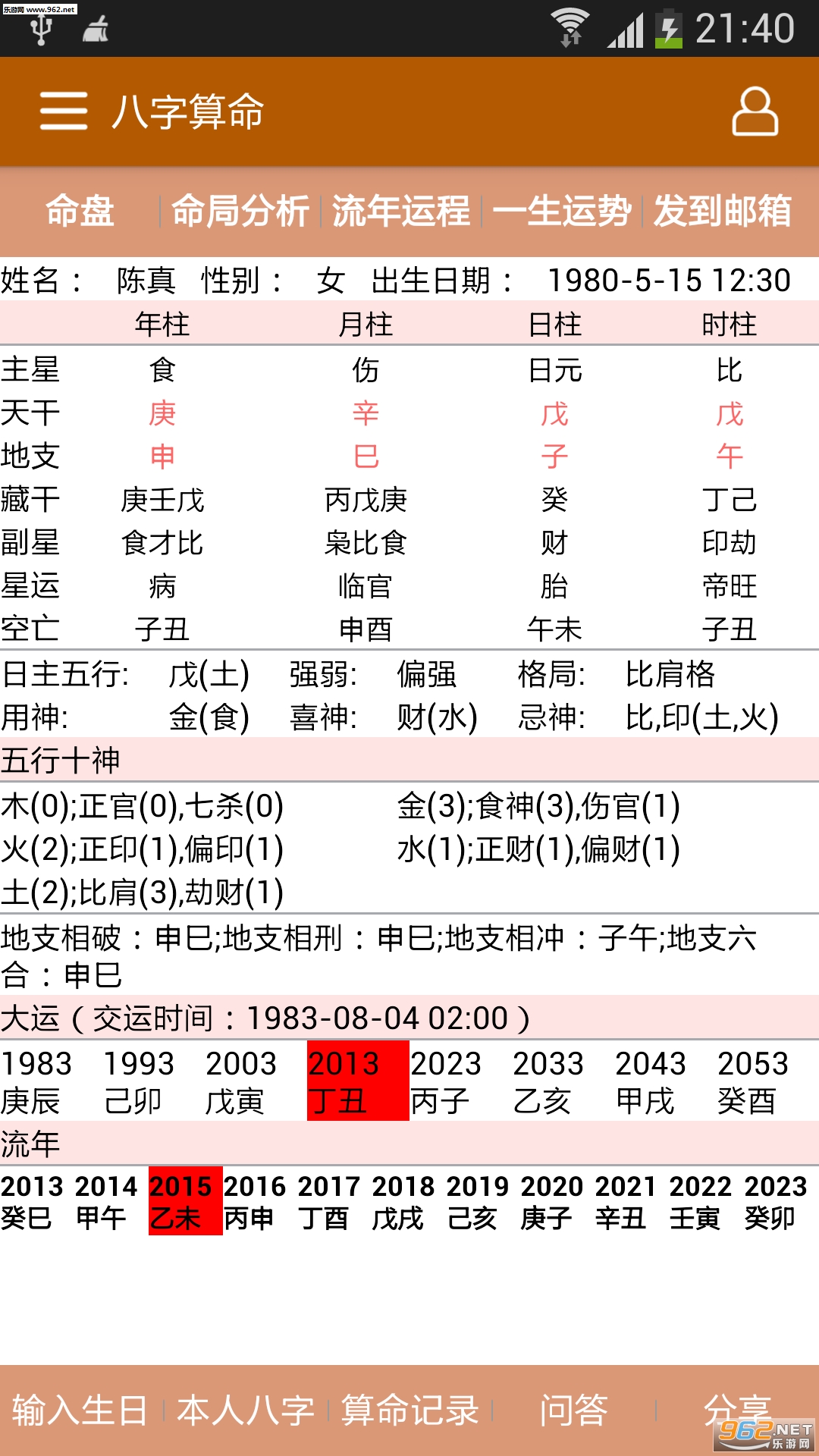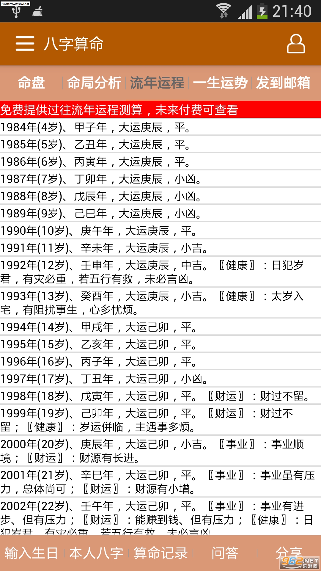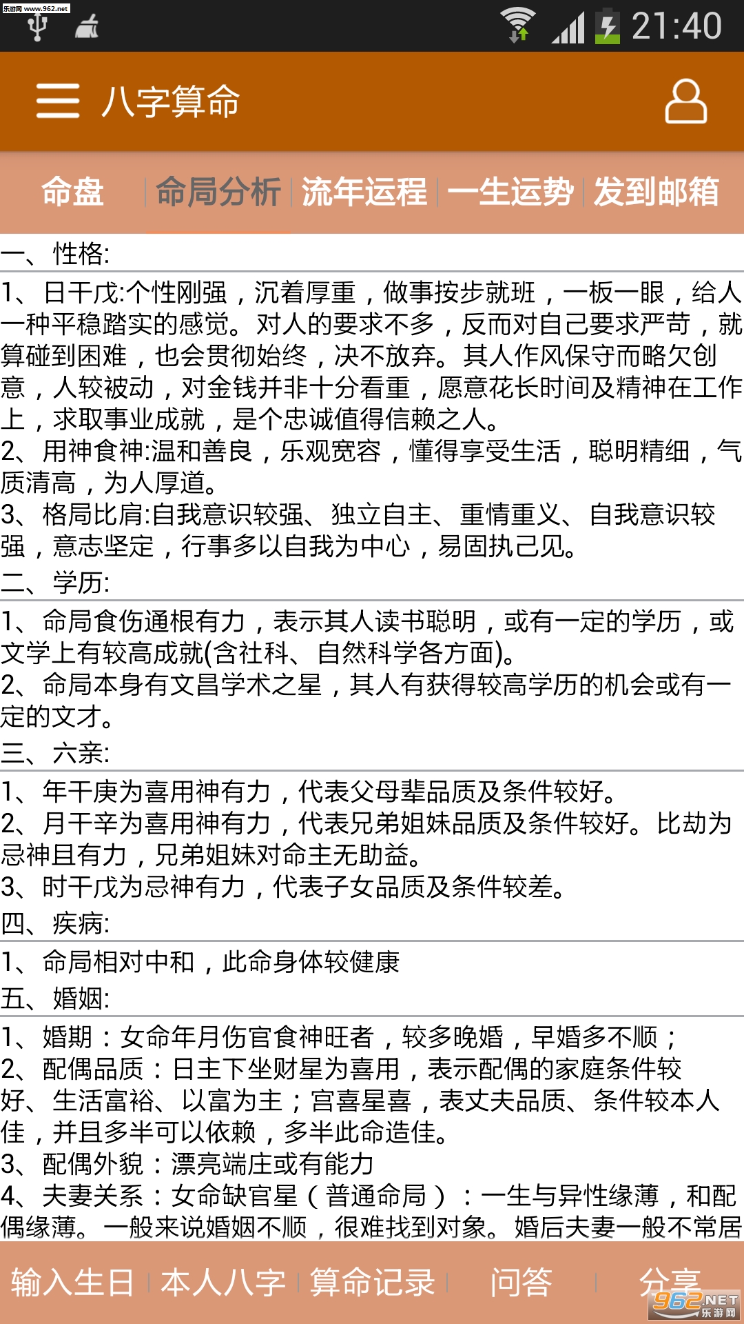 2、每天运势:提供每天运势、每周运势、每月运势、每年运势,包括财运、事业运、健康运等,为用户提供行事决策参考。