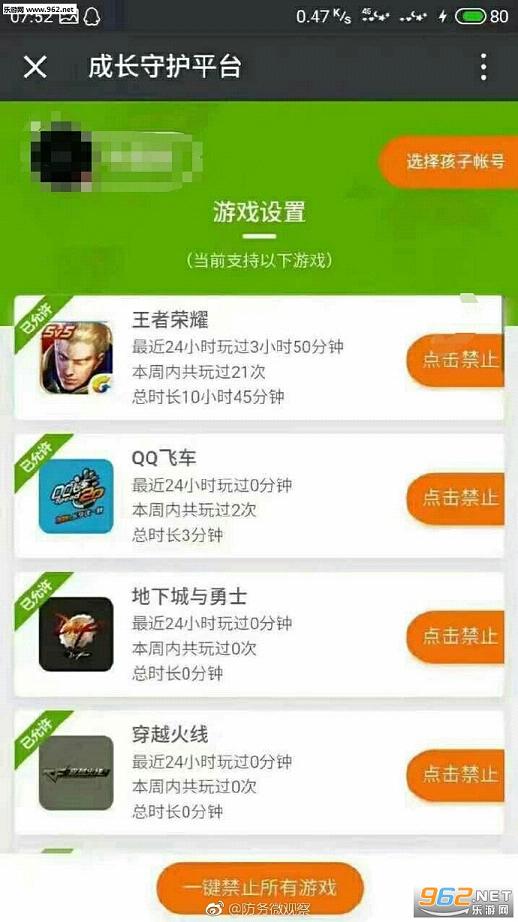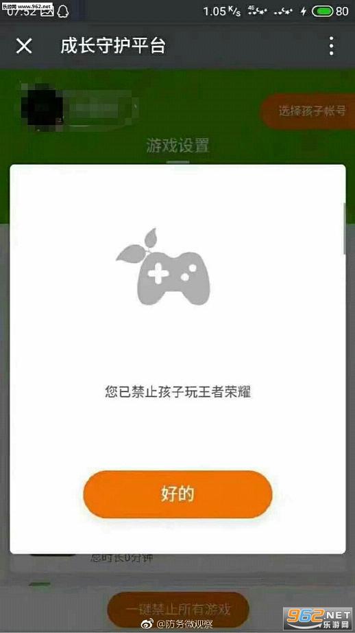 同时,您还可使用搜索并关注公众号“成长守护平台”通过手机使用平台功能,守护孩子健康游戏。