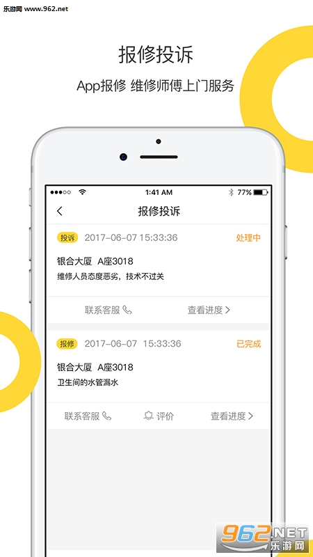 2、报修投诉,生活维修申报,能够第一时间内未用户解决
