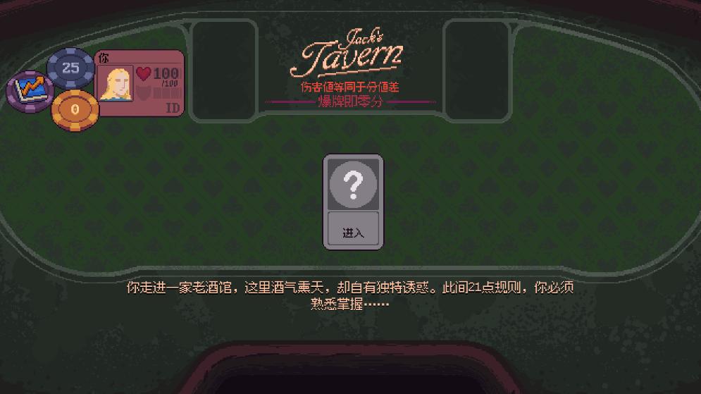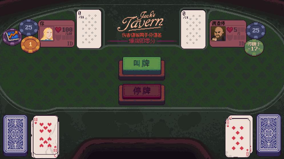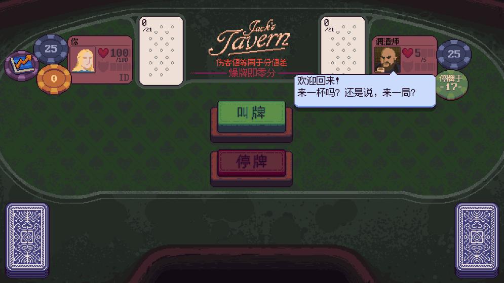 玩家将扮演一位跌跌撞撞进入酒吧的酒客,在牌桌上纵横捭阖,与形形色色的对手展开激烈的牌组对决。游戏不仅仅是传统的扑克牌21点对战,还融入了丰富多样的塔罗牌、节日贺卡,以及能够直接凑成21点的必胜牌等创新元素,为玩家带来新奇的体验。