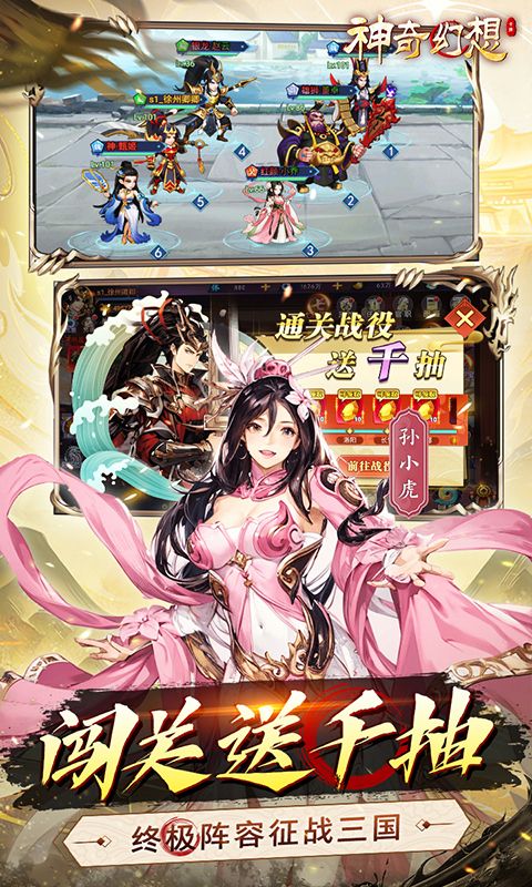 《神奇幻想(0.1折送千抽刷充)》0.1折送无限充值,免费充值每日刷宝!充值永久0.1折,上线送贵族6、转生精华*3888、点券*10000、元宝*8888。闯关送千抽,白漂武将征战三国。登录送豪礼,终极阵容战力狂飙!还有魔王挑战礼,终极魔王必爆古玉!精美的美术风格,酷炫的武将及技能,给你带来不一样的游戏体验。游戏内融入众多三国名将、还原真实历史,攻守城池、匡扶汉室、三足鼎立、你心中的第一武将会是谁呢?主公!等你来哦!
