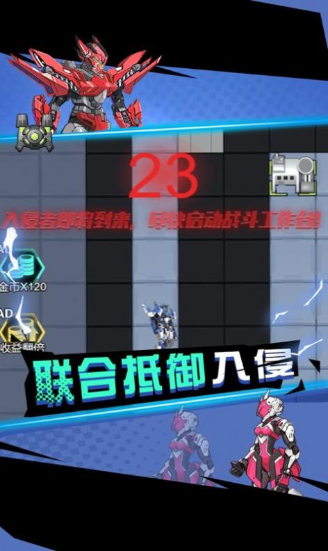 科幻风的塔防类策略游戏,随着人类科技进步的发展,越来越多新功能的机器人出现,其中有一种专门用来对抗外星侵略者的机器人,而你作为一名机甲战斗员,需要驾驶机器人在前线抵御外星怪物的入侵!建造各种各样的设施,消灭外星入侵者吧!