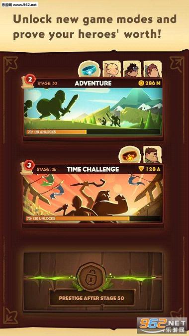 很快我们就展开了与敌人的较量,在这里我们可以解锁多个章节,但前提是必须在上一章节中完成若干关卡的挑战。每一个关卡意味着有 10 波敌人前来与你较量,最后一波为 BOSS。我们可以使用相应数量的金币来招募英雄,他们有各自擅长的战斗方式,不过这里并没有近战和远程一说,当你招募英雄之后他们就会立刻上场,无需操作和指挥他们便会挥舞手中的武器给予敌人伤害。