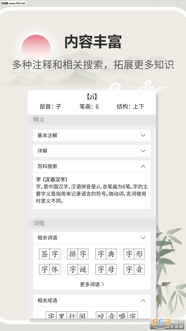 涵盖组词、成语、词典、近反义词等多条目