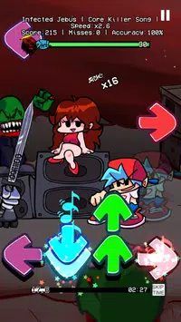你确实喜欢恐怖的东西,因为僵尸或疯狂的东西结合了小丑和僵尸。而且,在星期五晚上,当你和你的女朋友出去玩的时候,这样的一件事突然出现了。他敢于让您与 Funkin 音乐一起加入疯狂的 Funkin 战斗。当然!你没有选择。请尽力打败 Tricky 并保护你的女朋友。