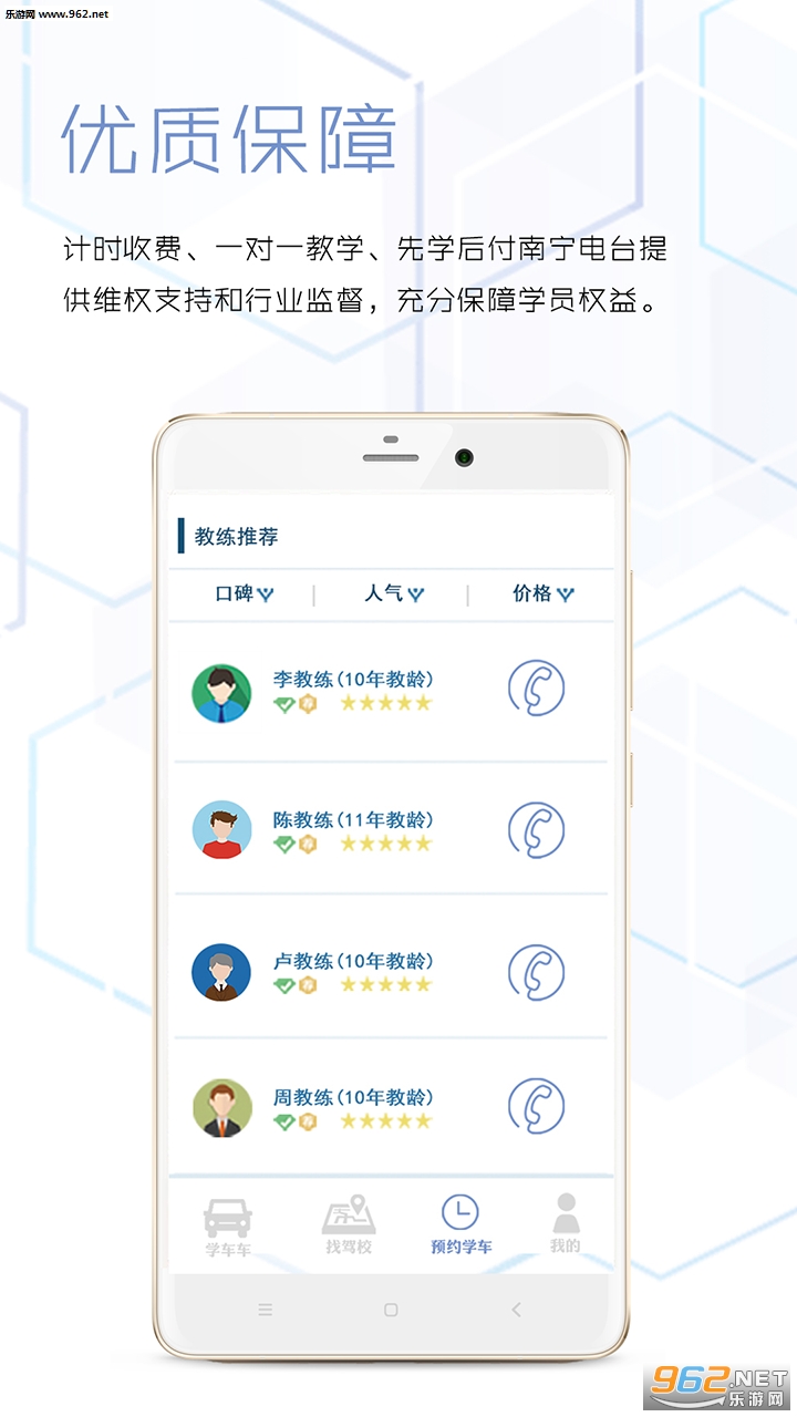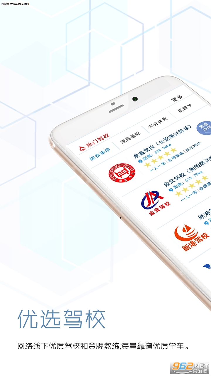1.优选驾校:网罗线下优质驾校和金牌教练,海量靠谱优质学车资源,上千名金牌教练,上千辆教练车,自主约培,想学就学