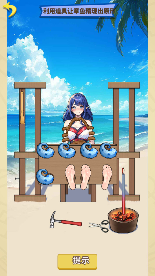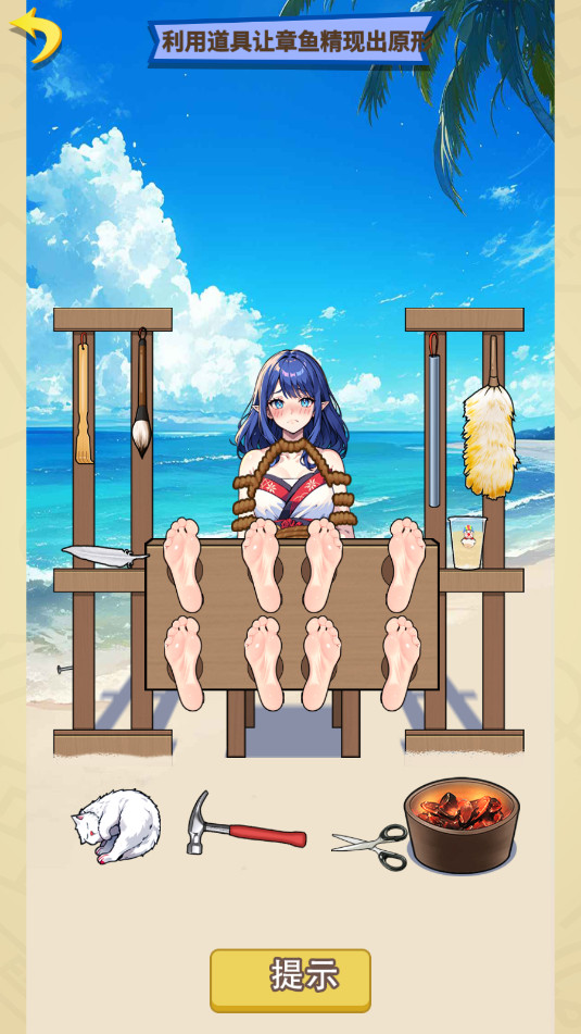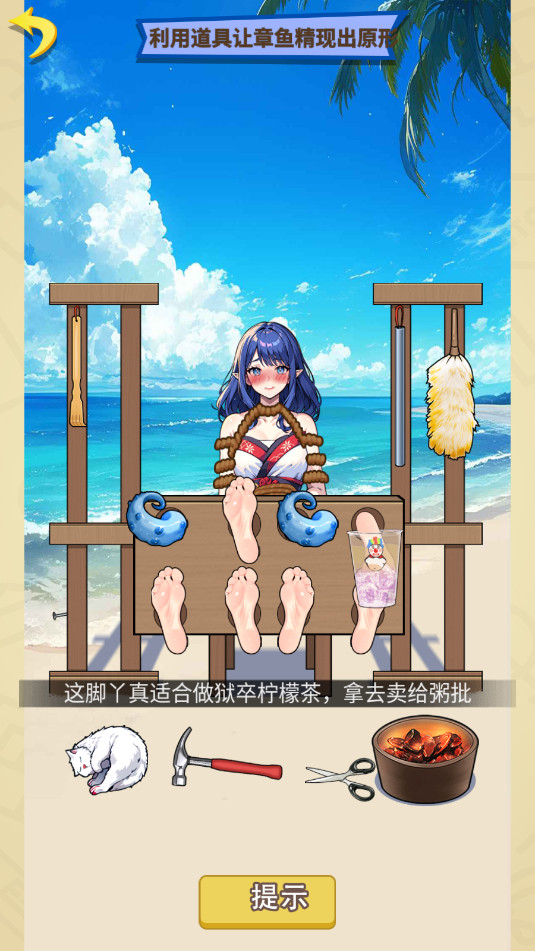 7.拖动锤子至左边木架底部拔出钉子,再拖动钉子至女生脚上